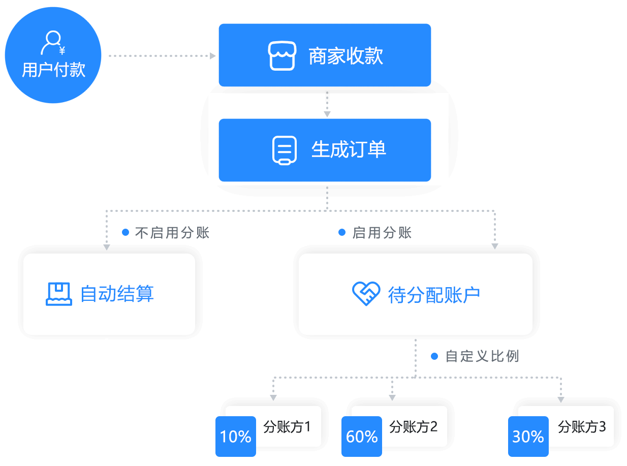 分账可以帮助平台商户与其入驻商家、上下游供应商、个人代理等,灵活有序的分享利益。